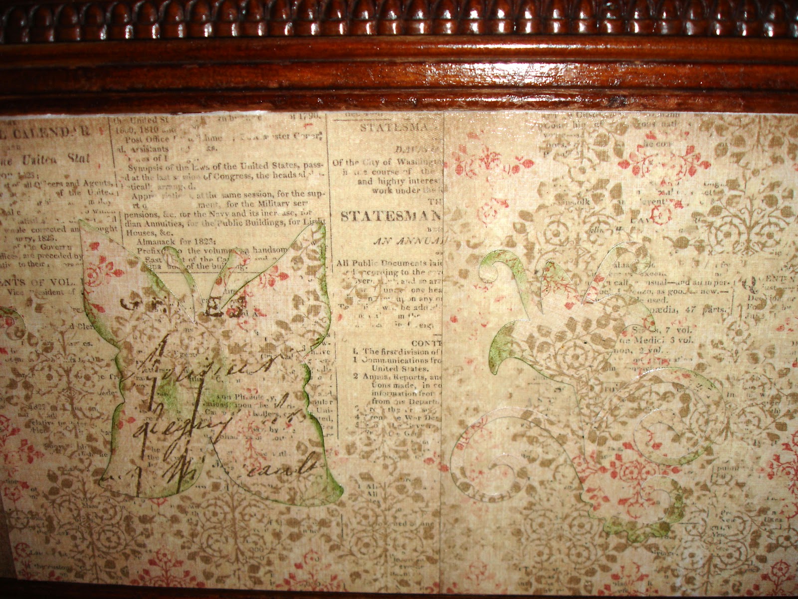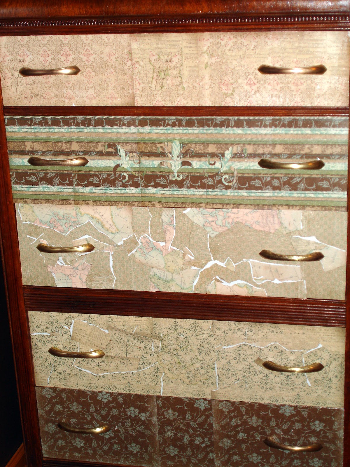 So I thought I had a picture of the dresser before but haven't found one. But one of our dressers was in pretty bad shape. We bought the dresser used 27 years ago when we got married. The veneer was cracking and coming off the dresser drawers. I saw a post of Pinterest where they used scrapbook cardstock and Mod Podge. A light bulb came on and I thought of a K & Co paper stack - Life's Journey I had been hoarding. :) I'm sure none of you do that. I also thought I would paint the drawer handles as they are a black/brown. Instead I started cleaning them with Brasso. Took a whole morning but I found out that the handles were actually brass. Here are the pictures of the finished product. I added lots of little touches like cutting out flowers, flourishes and butterflies out of the paper. I used the Storybook cartridge for that.