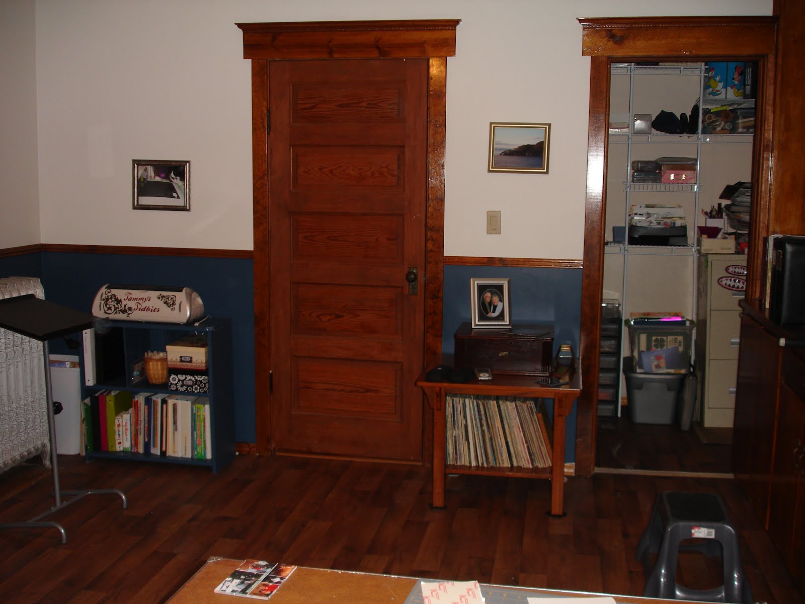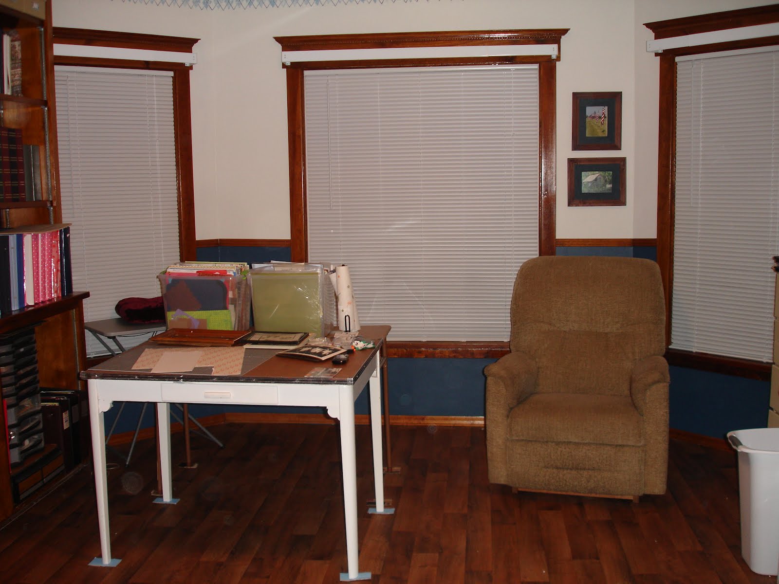 So we had painted the room an off white color. The shelves were from the basement and the art room in the old house. One was Olive Green and the others where a light green. I really thought I had a picture but apparently not. It was so boring.